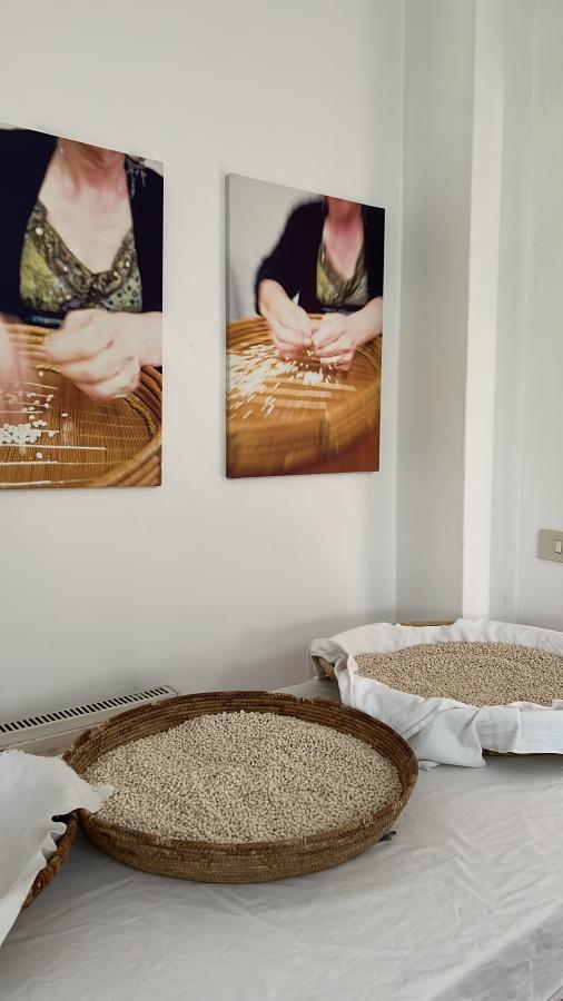 Cicciones (pasta) set out to dry in preparation for an August festival. The images on the wall are of an older woman preparing the cicciones, which are a tradition of the Sardinian town Bessude (photo: Elisa Delle Monache)