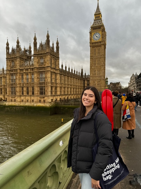 Victoria in front of London landmark, Big Ben, January, 2023 (photo: Karen McMahon)