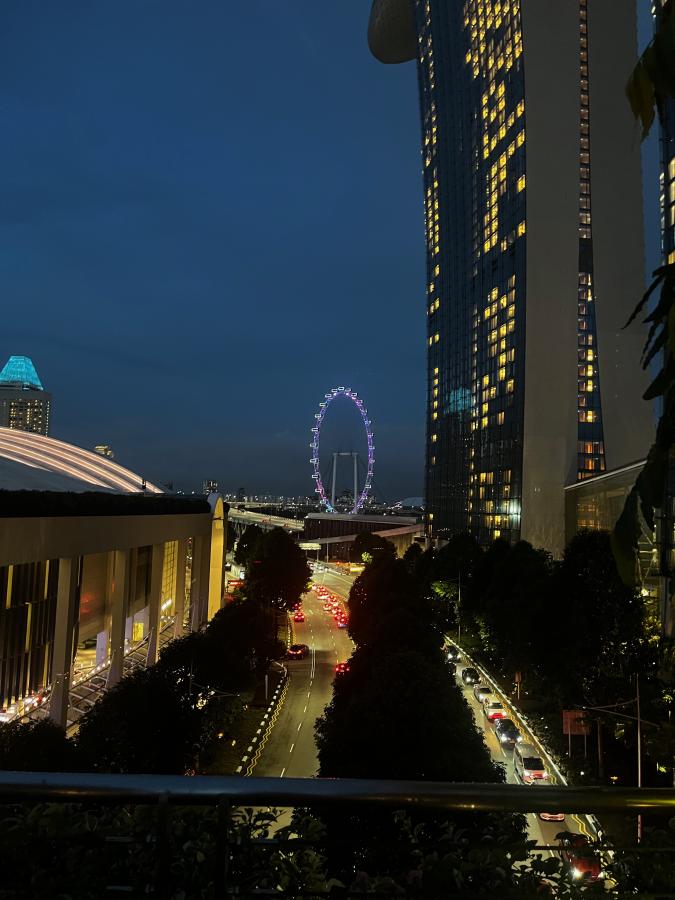 A side view of the Marina Bay Sands and Singapore Flyer Ferris wheel from a bridge (photo: Izzie Bjonness-Jacobsen)