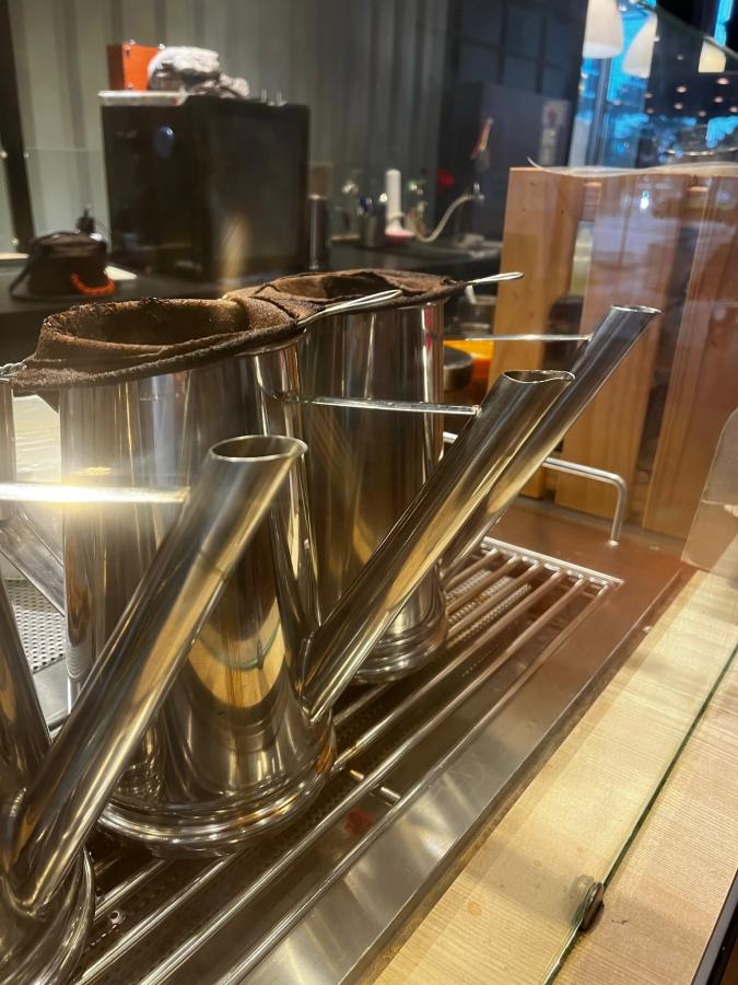 Kopi (coffee) pitchers at a kopitiam in Singapore (photo: Izzie Bjonness-Jacobsen)